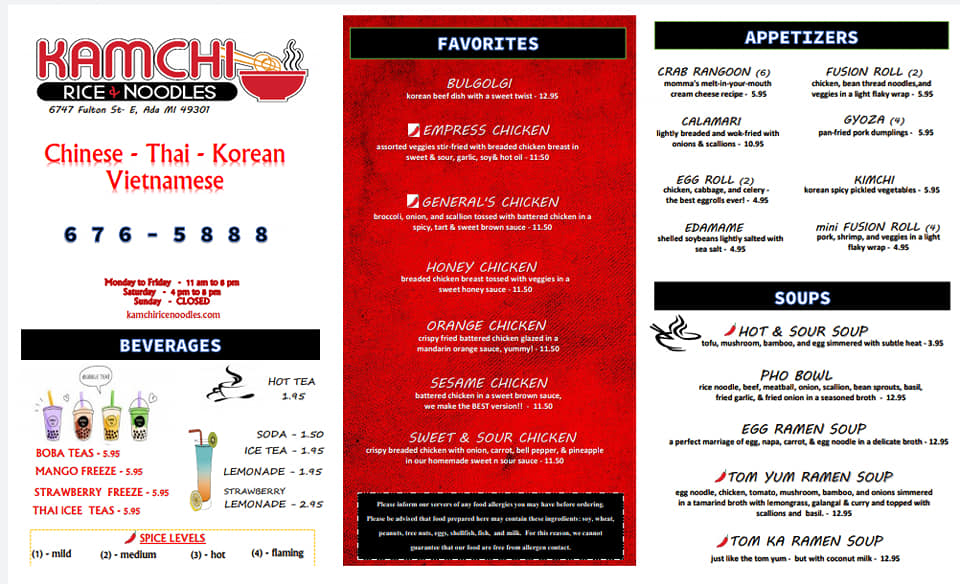 Welcome to Kamchi, a culinary gem located in Ada, MI, where authentic flavors meet innovative dishes. Our menu tantalizes taste buds with a delightful fusion of Korean, Thai, and Chinese cuisine. Start your meal with appetizers like our crispy calamari or creamy crab Rangoon, which have become local favorites.